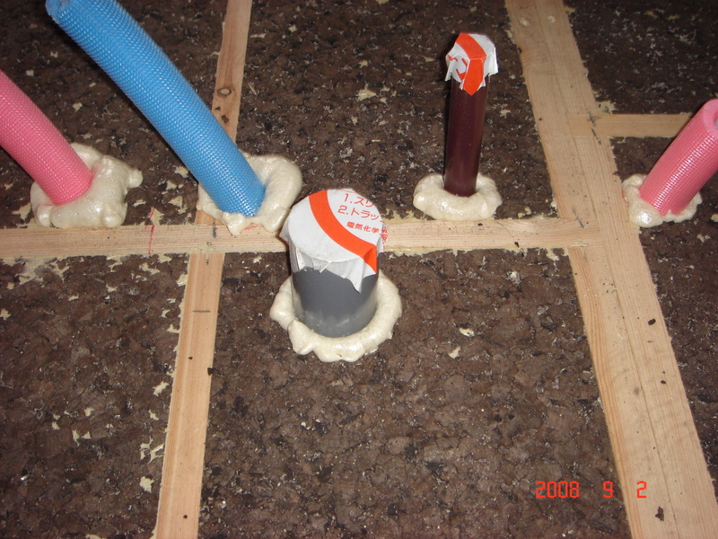 それから今日は自分で、配水管や給水官を立ち上げるために空けた床パネルの隙間を、ウレタンスプレーで塞ぐ作業をしました