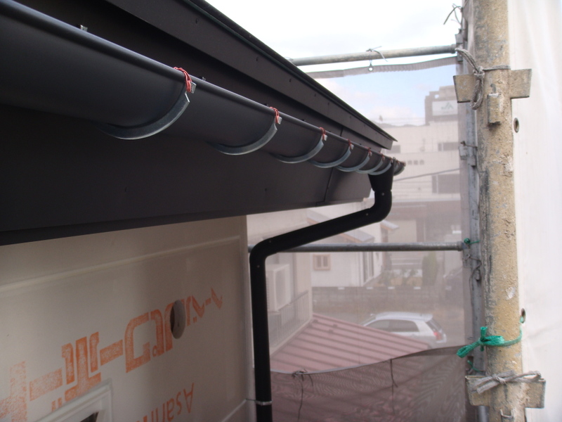 久しぶりに中央の報告をいたしますと、破風の板金工事と雨樋の取り付けが終わりました