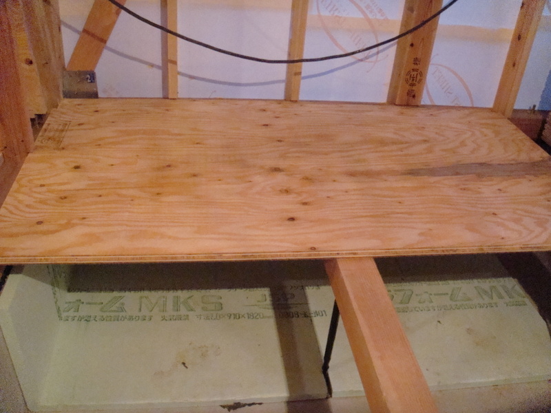 胴縁付けは今日で終わり、明後日から始まるオンドル工事に向けて、床下地工事が急ピッチで行われてます。今回の床下地には28mmの構造用合板を使用しました