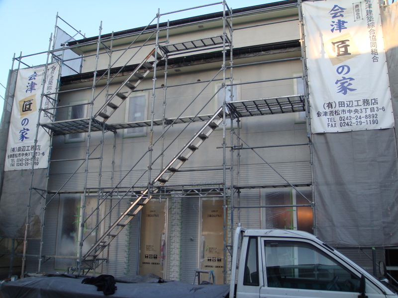 中央では少し前から外壁の塗装工事が始まっていて、今日で中塗りまでが完了し、たぶん明日から仕上の塗装が始まると思います![]()