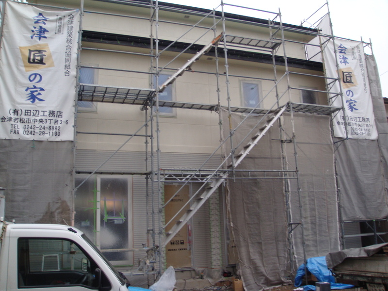 中央では今日から外壁の上塗りが始まったのですが、僕の管理不足で材料が足りなくなった為しばらく中断になってしまいました