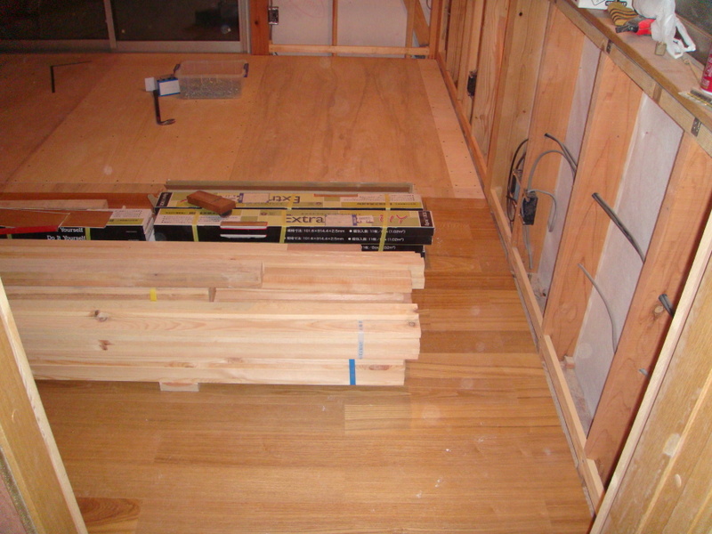 明日はリビングの残り半分のフロア貼りとボード貼りが行われます