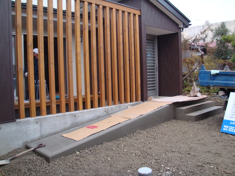 外構の方も玄関ポーチの型枠も外れ、スロープも階段も綺麗に仕上がっておりホッと一息です