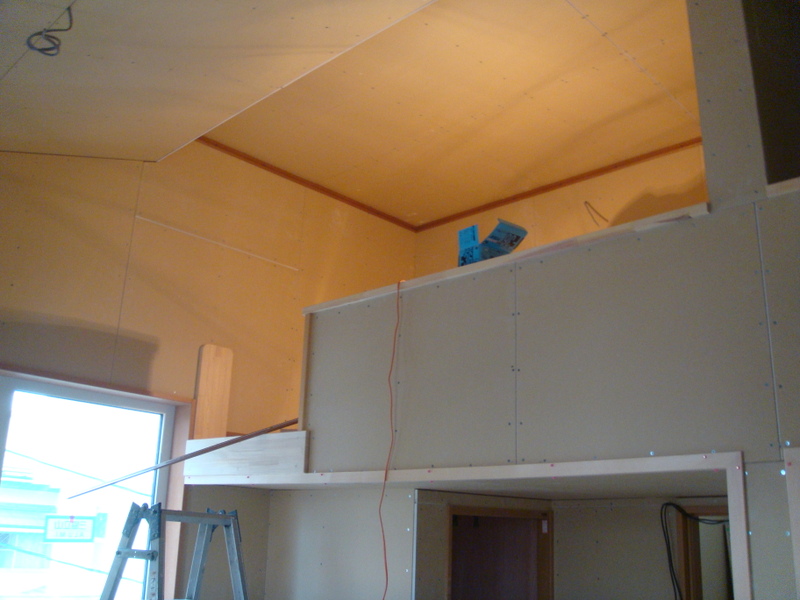 中の方では引き続き4人体制で行われ、2階では片方の幅木の取り付けが終わり、廻り縁の取り付けが行われてました