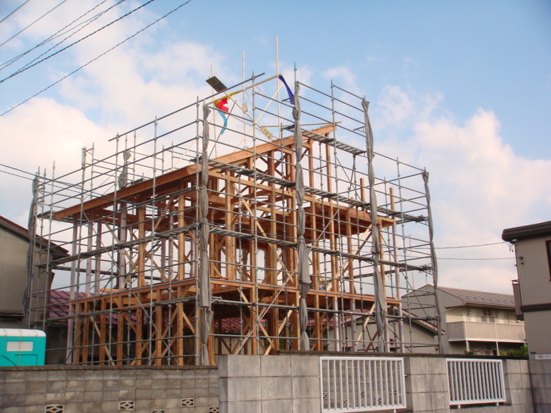 天候だけが心配だったのですが、夜中朝方に降った雨も朝には上がり(朝現場に来たら基礎の中はプールのようになってました)、午前中は怪しい雲行きの中での作業でしたが、午後からは嘘のように晴れ間が射して、上棟式の4時半頃には一番良い天気になってました