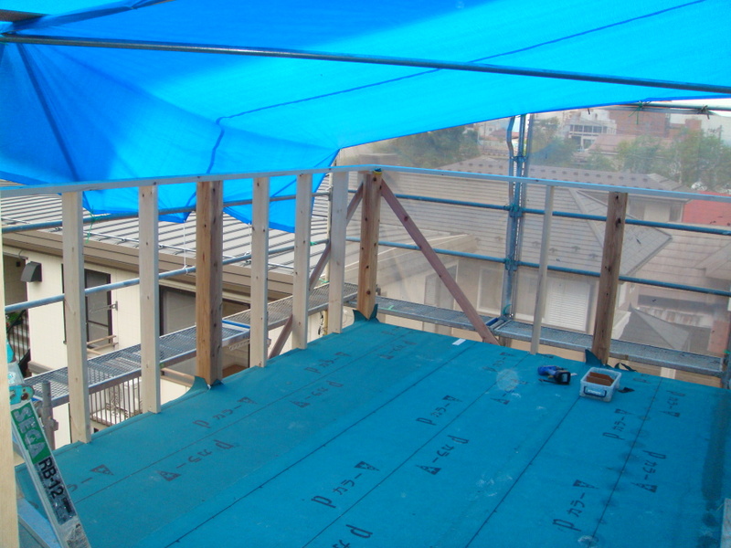 一時強い雨が降りましたが、行仁町S様邸新築工事はブルーシートで仮の屋根を架けて、屋上の手摺取り付け工事が行われました
