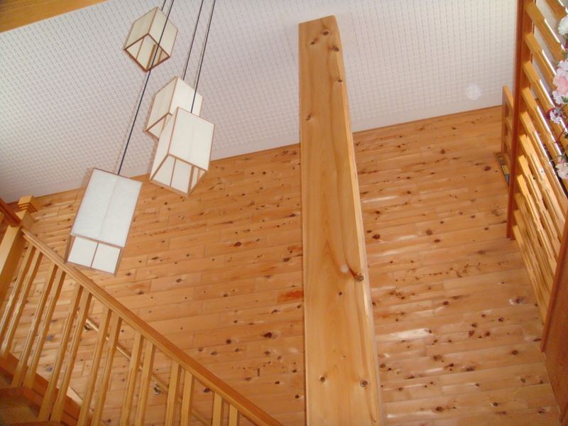下の写真は神指町M様邸の吹抜にそびえ立つ、1尺(30cm)の桧の通し柱です