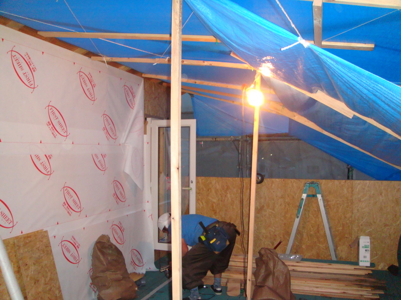 行仁町S様邸新築工事ではブルーシートで仮の屋根のかかった屋上での作業が行われてました