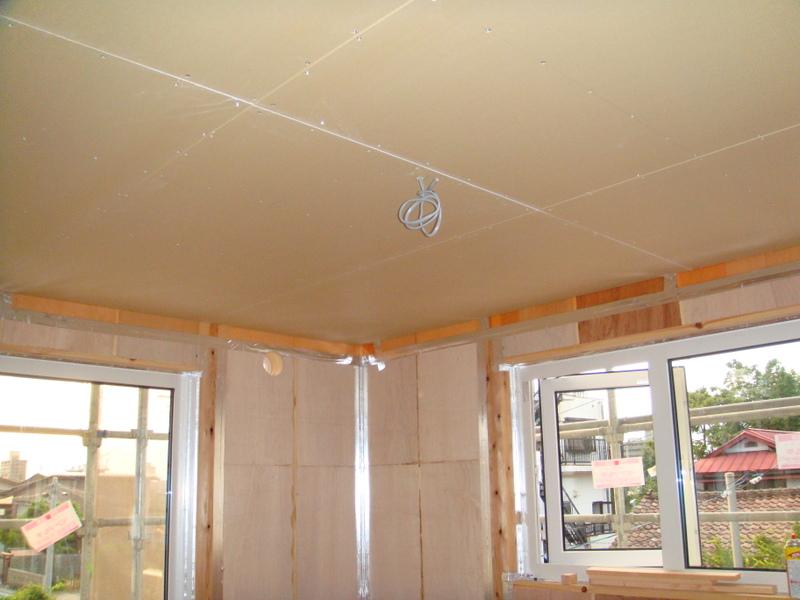 行仁町S様邸新築工事の外壁工事も、コーキングを残してほぼ終わり、中の方では天井の石膏ボード貼りが始まりました