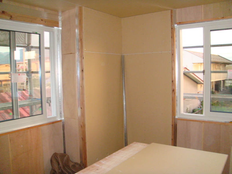 行仁町S様邸新築工事では、2階の天井と床の工事がほぼ終わり、内壁工事(石膏ボード貼り)が始まってました