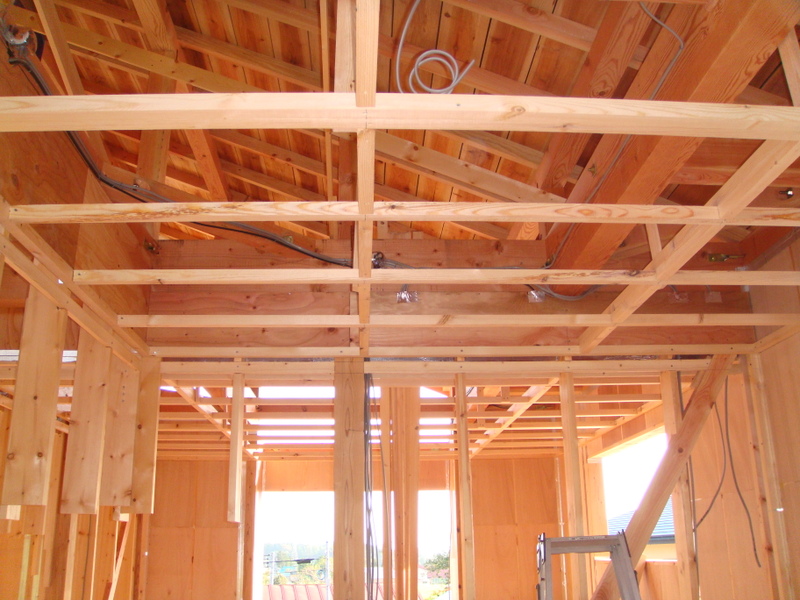 今日も秋晴れの天気に恵まれた中、磐梯町O様邸新築工事では、2階の天井下地が行われてました