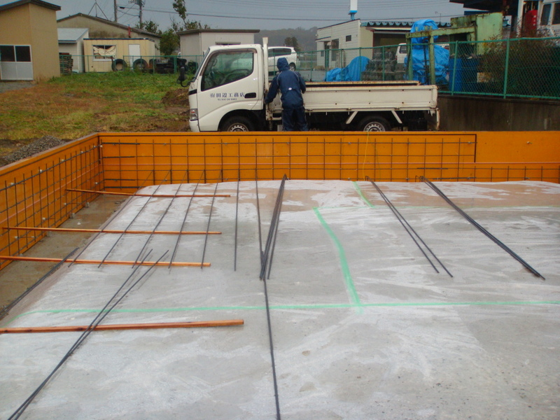 配筋工事では鉄筋と鉄筋の間隔が重要になるので、間隔を測りながら鉄筋を組んでいきます。順調行けば金曜日にコンクリートを打設する予定です