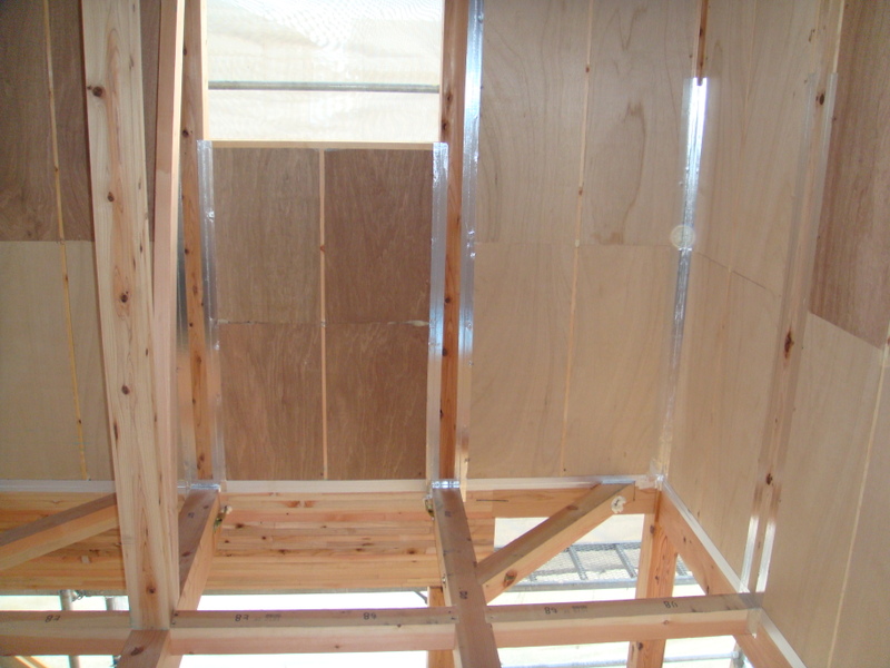 そんな手もかじかむような状況の中で、今日は気密テープ貼りや2階床の合板(下地)敷きが行われてました![]()