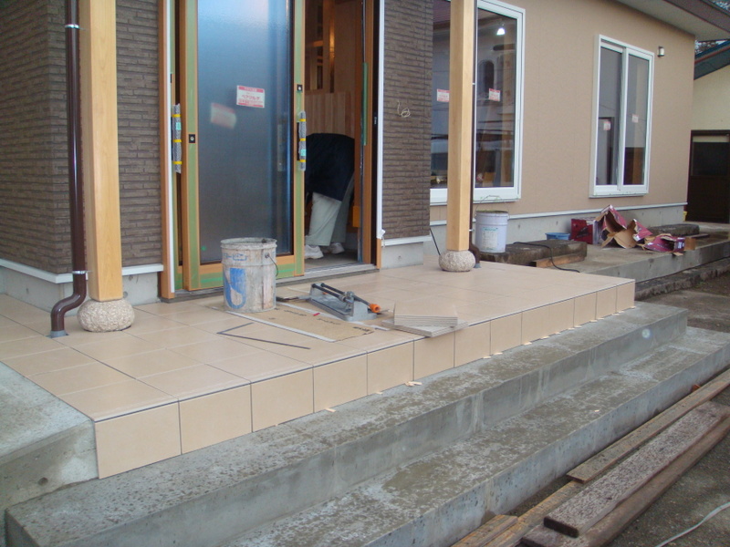 外の方では左官屋さんが、玄関ポーチのタイルを貼っていました![]()
