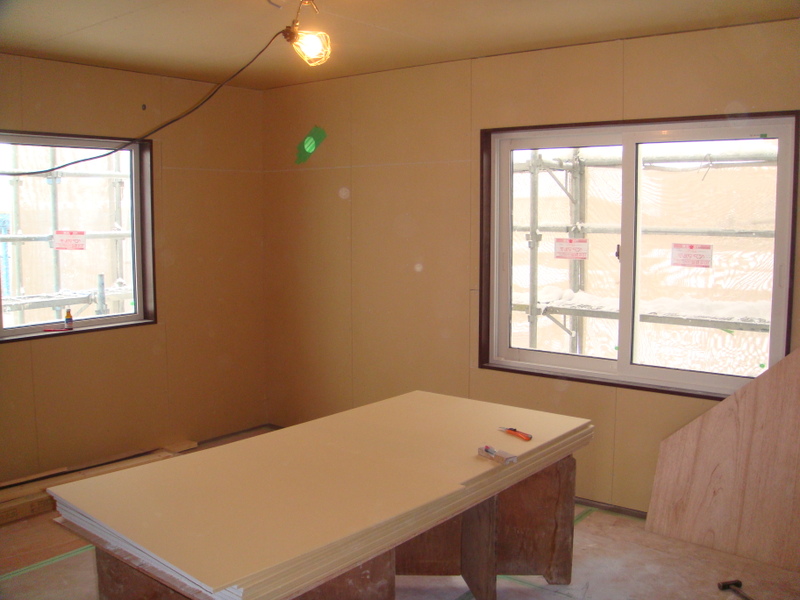 中の工事が順調に進み、ある程度寒さが凌げる河東町I様邸新築工事では、2階の下地(ボード貼り)がほぼ終わり、いよいよ1階の工事に突入です
