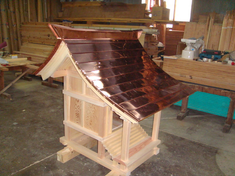 鳥居もお囲いも順調に進み、お社を迎える準備が着々と進む中、肝心のお社の方も無事銅板も綺麗に葺かれ、お社本体もほぼ完成になりましたが、今日はお社の建具やちょっとした飾り彫りが行われてます