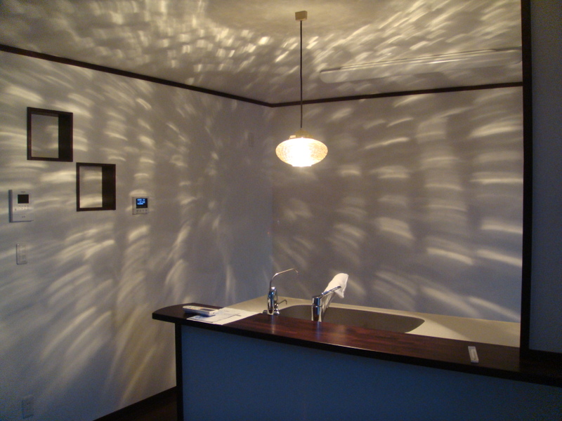 キッチンの手元灯はI様が家具屋さんで見つけてきた照明で、すごくムード満点な照明になってます