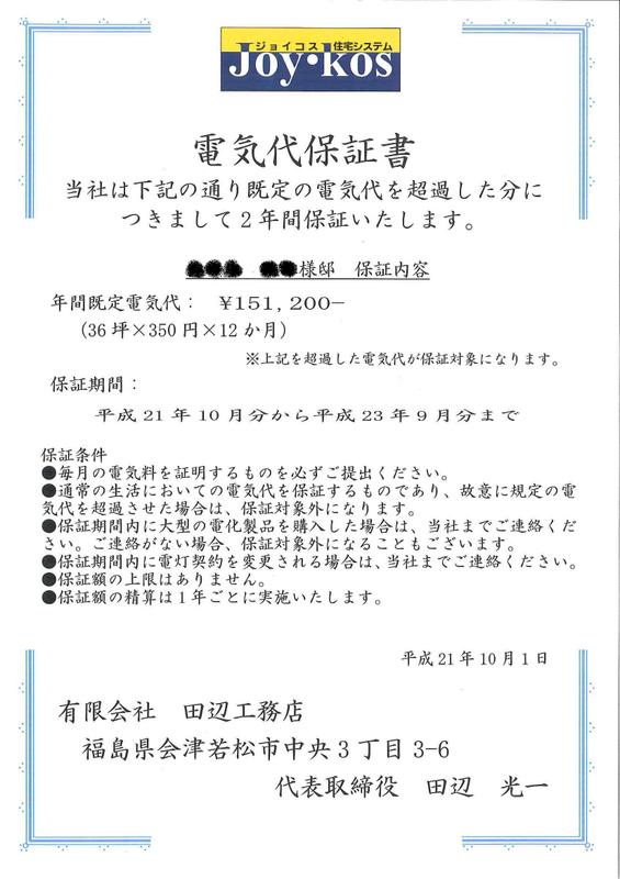 電気代保証とは、1坪あたりの電気代350円を超えた場合、オーバーした分の電気代を田辺工務店とジョイ・コスで負担するといったものです。