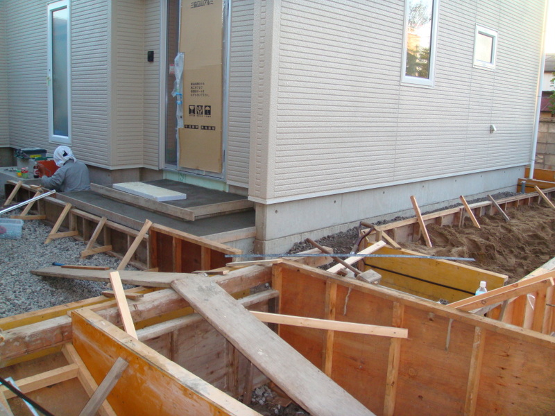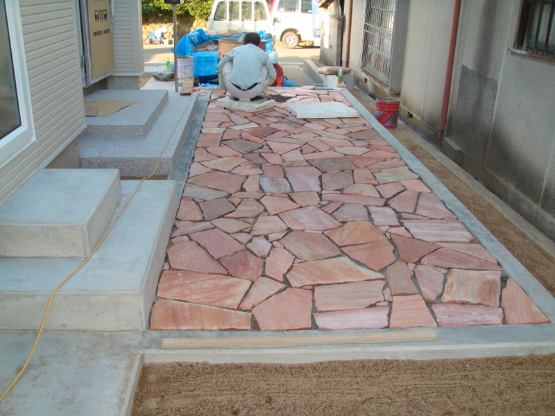 中でも左官屋さんがアプローチに乱形の石を貼っていたのですが、中々Goodな仕上がりになりそうです![]()