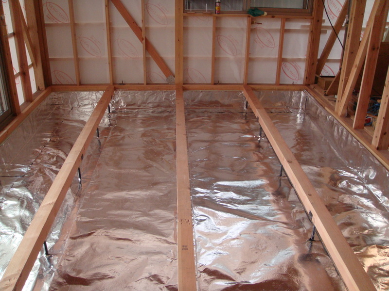 ③断熱材の上に3mmのアルミ箔シートを敷いて行きます。アルミ箔シートの目的は熱を反射させる事です。