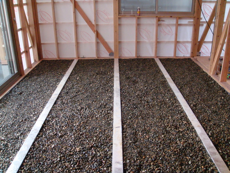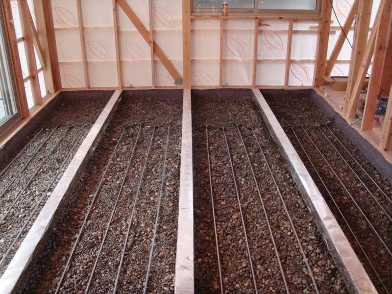 砂利は多ければ良いと言う訳ではなく、新築や改築、断熱や気密の状況によって砂利の量を決めます。今回の砂利の層の厚さは30cm(2tダンプ3台分)です。これだけの量の砂利があるために、一日中暖かくすることが可能になります。