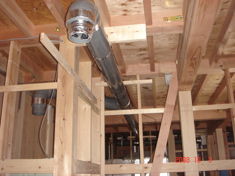 中の方では引き続き、24時間換気システムの配管作業が行われ、今日は2階の配管工事をしました(写真右)![]()