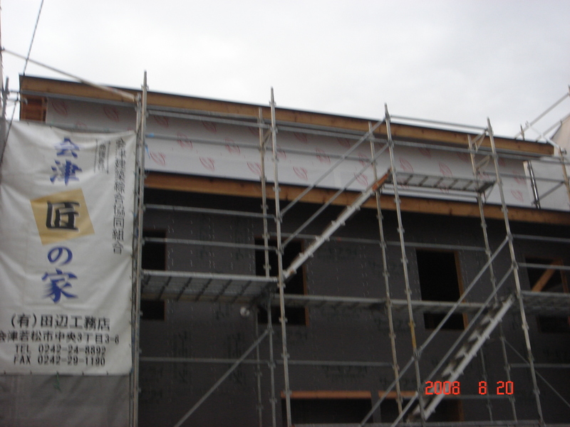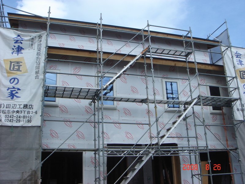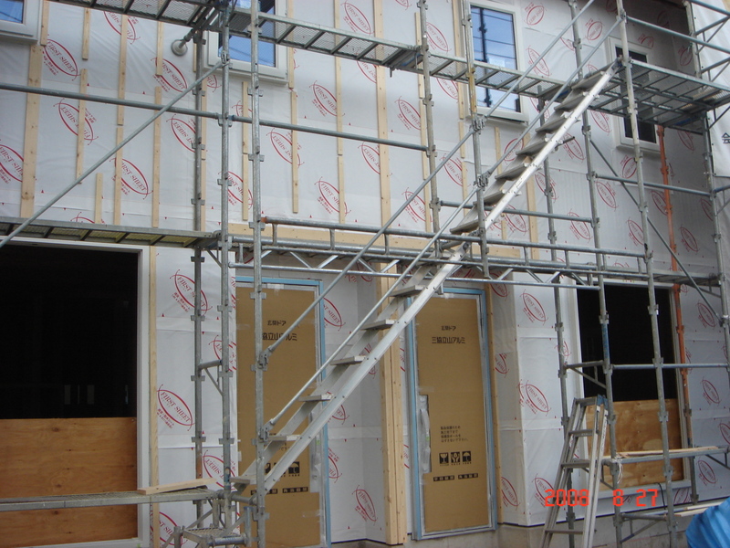 中央の工事は夕方から雨が降ってきたので、僕が行った時には中でサッシの内枠に気密テープ(銀色の部分が気密テープです)を貼ってました![]()