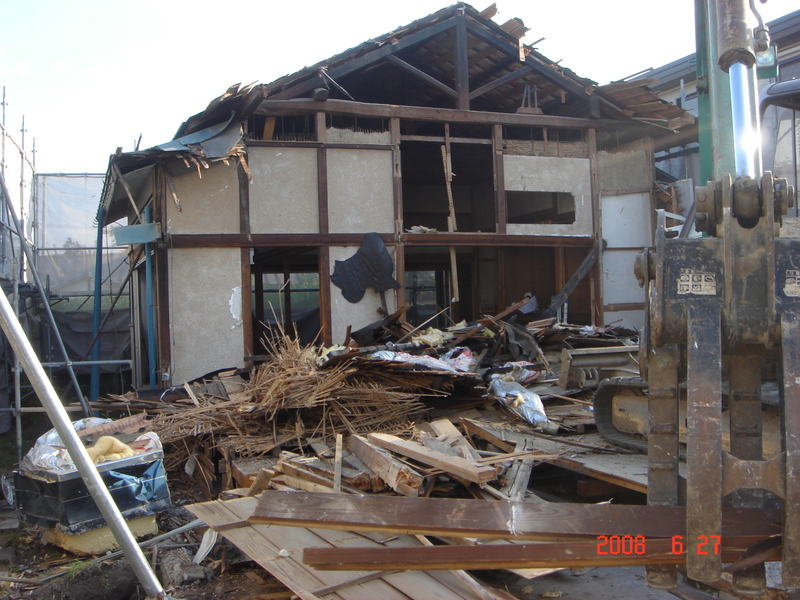 行仁町の解体工事も屋根の瓦が剥がされました、人手が足りなかったので社長も瓦剥がしに参加し、総勢6名で1時間で終わったそうです。明日から重機が投入されるので、どんどん壊れていくと思います![]()